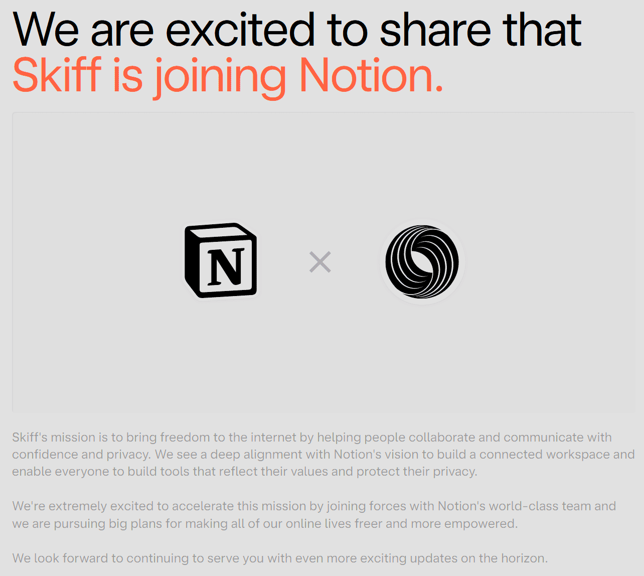 Yesterday, when I went to the website of my email provider, Skiff (a privacy-focused productivity platform), I came across the announcement that the company had been sold to Notion.